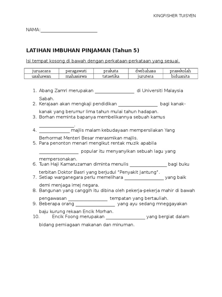 Imbuhan pinjaman tahun 5 latihan. For more information and source see on this link. Imbuhan Pinjaman Tahun 5 October 5 November 1 2016 1 June 1. 2 Sukan ____ itu akan dianjurkan oleh Singapura pada bulan Disember nanti.