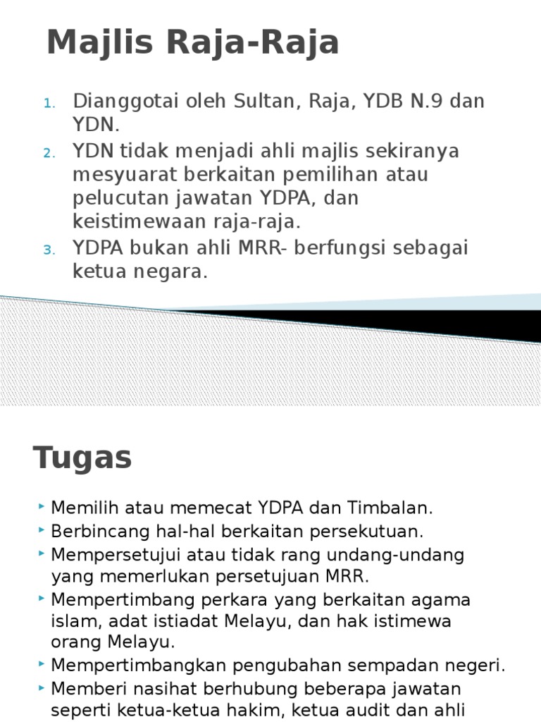 Kesimpulan Secara keseluruhannya fungsi Majlis Raja-raja dan YDPA mempunyai peranannya yang penting dalam hal-hal yang berkaitan dengan negaraKebanyakan negara-negara yang ada diseluruh dunia yang pada masa dahulu mempunyai Sultan atau raja kini lenyap institusi beraja itu dan kita sebagai rakyat Malaysia seharusnya menghargai dan berbangga kerana masih mempunyai. Kedudukan majlis raja raja dalam pemerintahan negara malaysia fungsi budibicara majlis raja raja mesyuarat majlis raja raja pengerusi mesyuarat kekerapan mesyuarat penasihat kepada duli yang maha mulia tuan yang terutama dalam mesyuarat majlis raja raja. Islam sebagai agama persekutuan dan kedudukan agam.