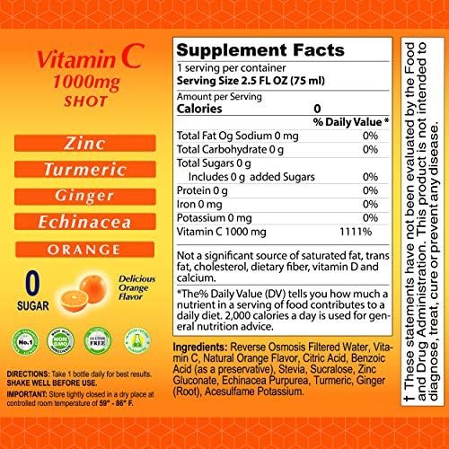 Amazon Com Vitamin C Shot 1000mg Immunity Booster With Zinc Turmeric Ginger Echinacea Protect Your Immunity Fight The Common Cold Orange Flavor 2 5 Fl Oz Per Bottle