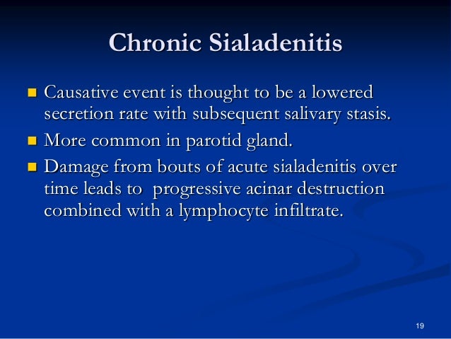 Seven patients with chronic sclerosing sialadenitis were female and 6 were male. Acute sialadenitis is most commonly caused by an ascending bacterial infection with Staphylococcus aureus or Streptococcus viridans being the most common organisms 289. Severe pain and swelling of the affected gland that comes on suddenly.