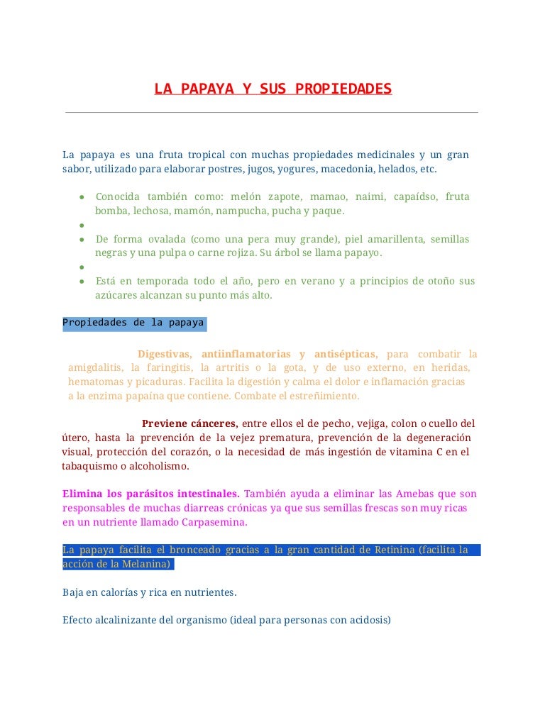 Tiene leves propiedades broncodilatadoras y antiespasmódicas. Además de ser un nutritiva contiene papaína una sustancia que puede ser aprovechad Valor nutricional de la papaya Lámina resumen de las propiedades medicinales de.