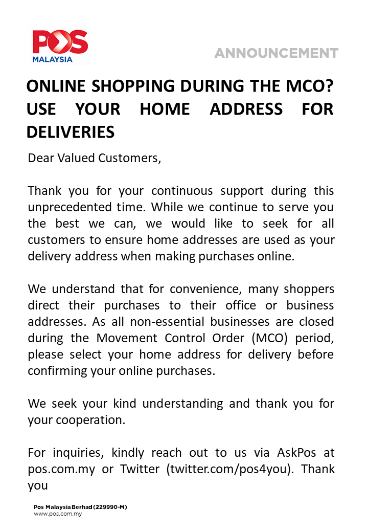 Pos Malaysia Berhad On Twitter Hi Ashmeet Monga Thanks For The Inquiry For Redirection The New Address Must Be The Same Under Poslaju Territory If The Address Under Other Poslaju The Request Unable