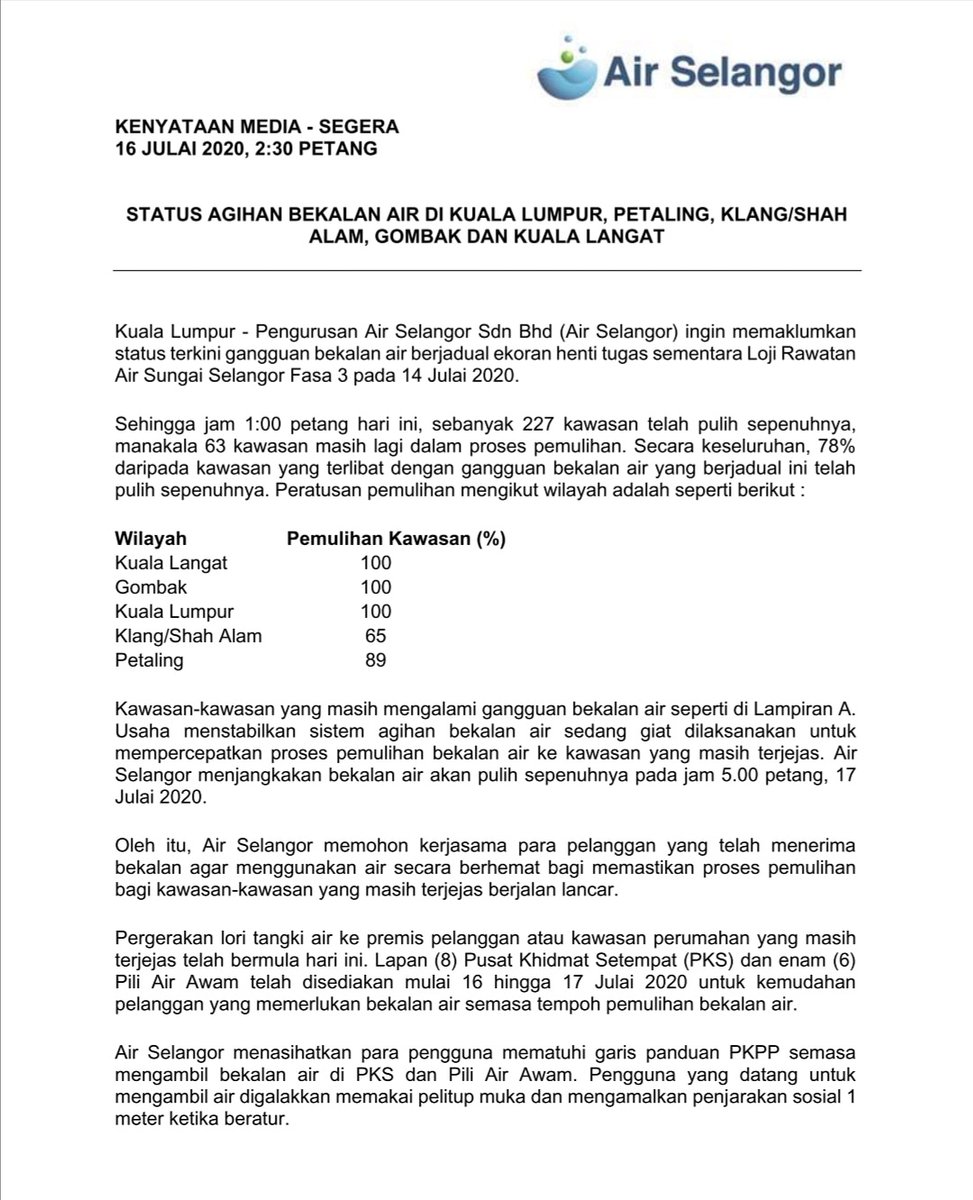 Media Selangor On Twitter Infokini Status Peratusan Pemulihan Bekalan Air Mengikut Wilayah Sehingga 1 Petang Hari Ini Kuala Langat 100 Gombak 100 Kuala Lumpur 100 Klang Shah Alam