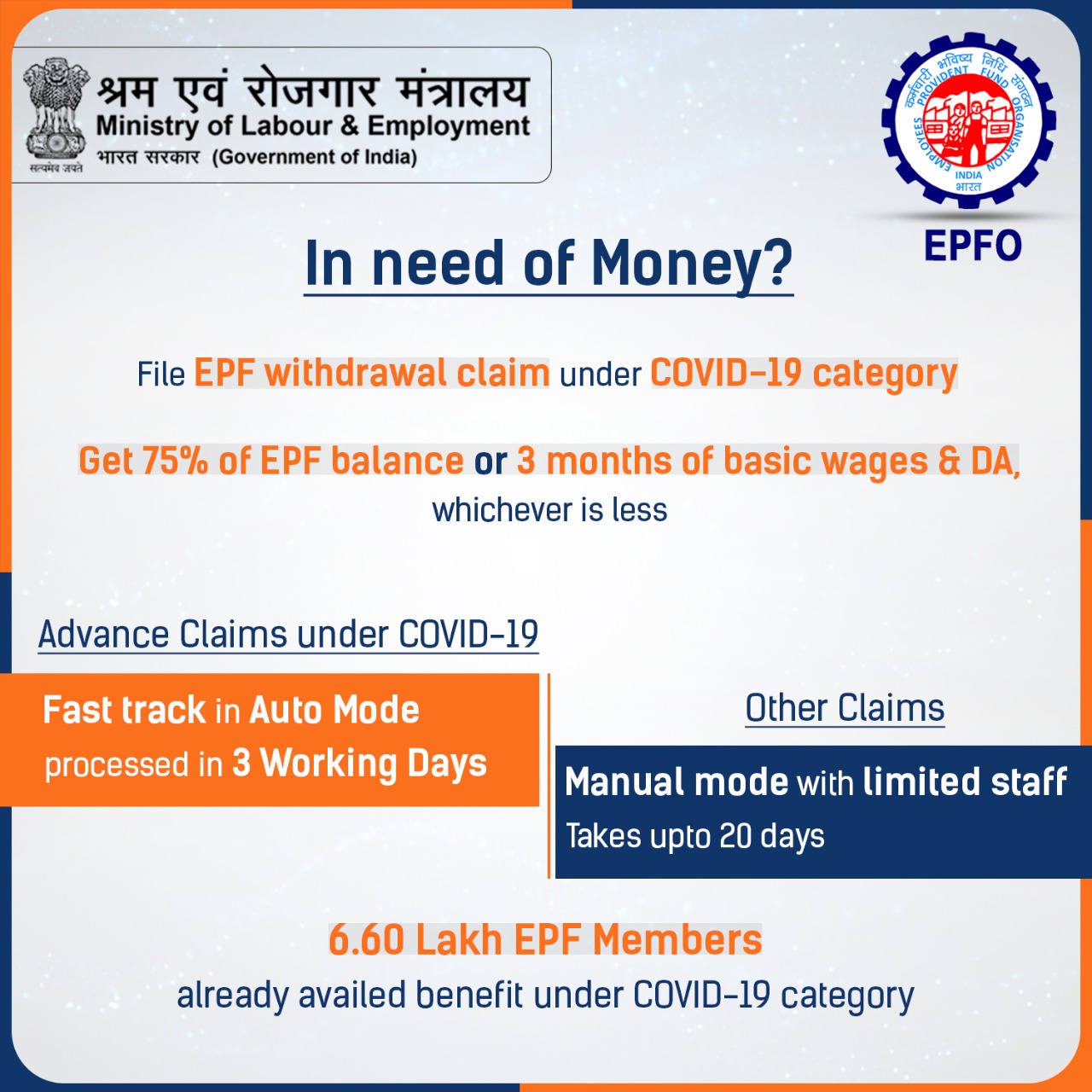 Epfo On Twitter File Epf Withdrawal Claim Under Covid 19 Category And Get 75 Of Epf Balance Or 3 Months Of Basic Wages Da Whichever Is Less Indiafightscorona Epfo Coronavirusoutbreak Socialsecurity Https T Co Veijqedwcq