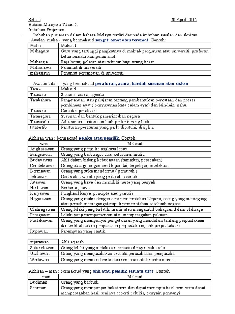 Imbuhan Pinjaman Nota Docx. Kata Imbuhan Pinjaman Tahun 5. 3 _____ buku itu mengulas sedikit pandangan penulis tentang sukan di Malaysia.